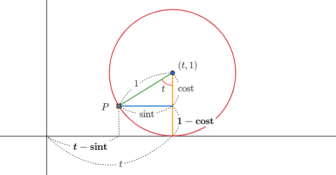 이때 의 자취 로 만들어진 곡선을 사이클로이드 곡선이라고 한다.